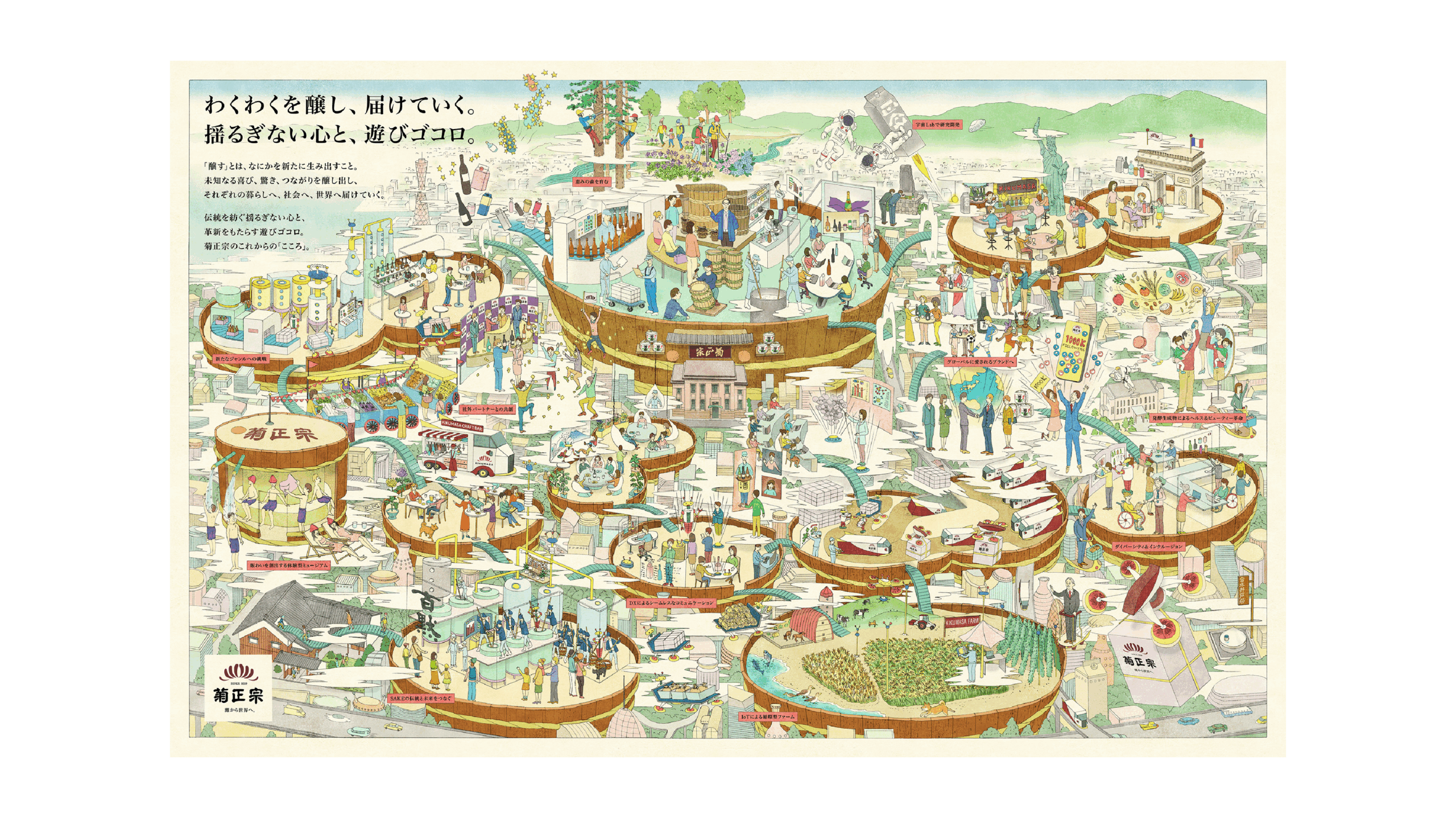 菊正宗のこれからの「こころ」を届けるビジョンを抽出。EXIDEAは菊正宗と共に、新しいビジョンを再考しました。導き出したビジョンは、「わくわくを醸し、届けていく。揺るぎない心と、遊びゴコロ。」象徴となるビジョンマップでは、生酛造りの「半切り樽」を新たな価値創造のステージとして360余年続く伝統という土台から溢れ出した「遊びゴコロ」が、暮らし、社会、世界、そして未来へと広がっていく姿を表現しました。